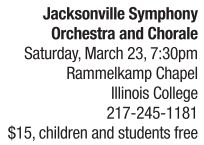 MUSIC | Splendid performance The Jacksonville Symphony Orchestra and Chorale present, “A Golden Collaboration” sponsored by Jim and Fran Ringle. Mozart’s Coronation Mass includes special guests Illinois College Choir and Millikin University Choir 2013 along with the 2003 Talent Among Us grand prize winners oboist Juliana Georges and violinist Clayton Penrose-Whitmore (pictured). Clayton Penrose-Whitmore, originally from Springfield, will be play Wieniawski Violin Concerto No. 2. Tickets are available at the door. See also