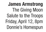 BAND SPOTLIGHT | James Armstrong Some people play the blues and some people listen to the blues, but James Armstrong just is the blues. From starting his first band in seventh grade to traveling the country playing major festivals and shows, Armstrong made music his life’s work and coincidently, Springfield his home. Born in Los Angeles, Calif., as a young man he worked with greats Smokey Wilson and Albert Collins, spent some time on HighTone Records and now continues the tradition of honoring the electric blues every time he straps on his guitar and steps up to the microphone. Known as a powerful and soulful guitarist, his songwriting prowess sets him apart from other musicians and he’s called the Ambassador of the Blues. At this weekend’s event, Armstrong joins with St. Louis indie-rock group, The Giving Moon and sponsors Myers Commercial Real Estate, Butler Funeral Home, Budweiser Brewing Company, Skeff Distributing, Capcitill Promotions, EJ Productions and Moonlight Rider Livery Services to honor and celebrate American military service people (a military ID gets you in for free). See also