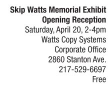 ART | Transparent watercolors The Skip Watts Memorial Exhibit and opening reception, April 20, from 2-4 p.m. at Watts Copy Systems, stands out as a milestone event for Springfield and the Sangamon Watercolor Society. Some of the best watercolor artists from throughout Illinois vied to have work in this exhibit. Winners of $10,000 in prize money will be announced during what looks to be an amazing afternoon of art and fellowship. Exhibit judge and nationally acclaimed watercolorist Paul Jackson will speak via a large screen television and the exhibit of 50 finalists’ work will be on display. Learn more about the Sangamon Watercolor Society and the show at sangamonwatercolor.com. See also