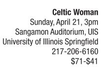 MUSIC | Enchanting ensemble Celtic Woman comes to Sangamon Auditorium, UIS on Sunday, April 21, for an afternoon show at 3 p.m. A sensational musical treat, the popular all-female adult contemporary singing group from Dublin, Ireland, will perform traditional Irish tunes, inspirational songs and pop classics. You’ll hear fan favorites such as “You Raise Me Up” and “Orinoco Flow.” The songsters are under the musical direction of Emmy-nominated music producer, David Downes. With more than 50 million records sold worldwide and three gold and platinum albums, Celtic Woman is a show not to be missed, and it doesn’t get any better than being there in person. See also