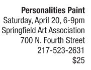 ART | Celebrity soiree Springfield Art Association’s Personalities Paint, April 20 from 6-9 p.m., is a fun party for a good cause. Art exhibit openings are always a blast, but at this one you can rub elbows with some of the most well-known local personalities and perhaps take home their work. Their paintings, on 10-inch by 10-inch canvases in celebration of the SAA’s 100-year anniversary, will be on display and for auction or sale during the reception. A few of the hometown celebrities include Illinois Times contributor and musician Tom Irwin, radio hosts Amie Meneghetti and Bob Murray, Liz Willis Soldwedel, Lynelle Loftus, Grace Luttrell Nanavati and Hope School kids. New this year is also art by professional artists Bill Crook, Charlie Houska, Felicia Olin, Sheri Ramsey and Janet Seitz Carlson. Jane and Phil Locascio chaired the soirée. See also