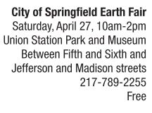 ENVIRONMENT | Keen on green Celebrate Earth Day with the City of Springfield at Earth Fair on Saturday, April 27. Activities will be held downtown this year at Union Station Museum and Park just west of the Abraham Lincoln Presidential Museum. Browse an array of vendors who will offer environmentally friendly products and services available in our area. Bring your bicycle to get it fixed, create a reused art project and view a recycled art exhibit inside the old train depot. There will be kids’ activities and CWLP Energy Services will again host the Great Refrigerator Roundup Decorating Contest. Vote via a paperless voting booth for your favorite decorated refrigerator by middle and high school students. Zero Waste Challenge is the theme of this year’s Earth Fair, held rain or shine. Learn to reduce your carbon footprint while having fun. See also