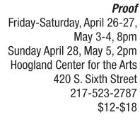 THEATER | Mad genius Springfield Theatre Center presents the four-person play, Proof, on two weekends, April 26-28, May 3-5. The story of love, trust, sacrifice and the disputed line between madness and genius, centers on Catherine, who cares for her genius but mentally unstable mathematician father, Robert. Robert dies and comes back in flashbacks as Catherine tries to prove that a math proof is her own and not that of her dad, and that she is not unstable like him. Alex Heinen plays Catherine; Harvey Mack, Robert; Mike Nelson as Hal; and Catherine Grant as the sister. Get a preview of Heinen, also a singer, on her YouTube channel, The Eccentricities of a Nightingale, with more than 12,000 subscribers and some videos with views of almost 30,000. This is Nelson’s first play. Director Jen Wallner calls him “great.”