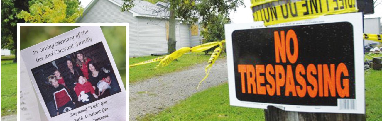 Ruth and Raymond “Rick” Gee married in 1997. Rick Gee was a contractor who owned his own construction company. They had two children together, Tabitha and Austin, and Ruth’s two children by a prior relationship, Justina and Dillen, also lived in the small house that has been boarded up. Playground equipment and a large above-ground swimming pool, now falling apart, takes up most of the backyard; a Chevrolet Lumina minivan with tags that expired in 2008 is parked in the front driveway. At 16, Justina was the oldest child in the home. Her brother, Dillen, was 14, Austin was 11. Tabitha, who somehow survived a blow from a tire iron to her head, was 3.