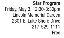 SCIENCE | Brilliant trails Join Lincoln Memorial Garden in an evening of stargazing on Friday, May 3. Dr. John Martin from the University of Illinois Springfield’s Astronomy and Physics program will kick off the agenda with an hour talk about planets, meteors and meteorites that can be seen in the night sky. There will be an opportunity to gaze through a telescope, thanks to Sangamon Astronomical Society members. Bad weather would postpone the program until Sunday, May 5. Questions as to whether the program is postponed should be made between 3-4 p.m. via phone to the garden. The event is free but reservations are required. Donations are always welcome. See also