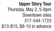 ARCHITECTURE | Unseen floors Downtown Springfield, Inc. presents its 14th annual Upper Story Tour on Thursday, May 2 during National Historic Preservation Month. The tour gives Springfield residents the opportunity to see historical, residential and commercial spaces downtown that are not usually open to the public. Tour sites include: 930 E. Monroe Street; 524 E. Monroe; 518 E. Monroe; 215 S. Fifth Street; 118 S. Fourth Street; and 115 N. Fifth Street. Read details on these buildings at www.downtownspringfield.org. A reception will be held at The Alamo, 115 N. Fifth Street from 7-9 p.m. and includes a complimentary beverage and light appetizers. Guests can get a sneak peek of the mural design for The Alamo and local artist Michael Mayosky will discuss his part in the city’s mural project. Buy tickets for the tour in advance at the DSI office, online until 2 p.m., or at the door of all tour locations. See also