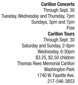 MUSIC | Sweet carillon There’s never been a better time to visit Thomas Rees Memorial Carillon in Washington Park. Enjoy free 30-minute weekly concerts four days a week with two performances on Sundays. The park district’s carillonneur, Robin Austin, will play a variety of classical, folk and popular songs. Also, carillon tours resumed the first of May. Offered every 30 minutes on weekends and Wednesday nights, tours now include a live carillon performance. You need to ascend this 12-story tower at least once in your lifetime. The views of Springfield are amazing from the city’s highest elevation. Thomas Rees Memorial Carillon is the gift of Senator Thomas Rees, publisher of Illinois State Register from 1881 to 1933. Cast by a 300-year-old bell foundry Petit & Fritsen in The Netherlands, 67 cast-bronze bells range in weight from 22 pounds to seven tons. All of the bells are played manually using a keyboard located in the carillonneur’s cabin. See also