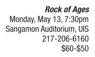 Theater lovers with a taste for rock ’n’ rock will get elated over a five-time Tony-nominated musical Rock of Ages, performed one night at Sangamon Auditorium. The show features a slew of fantastic 80s tunes such as “Don’t Stop Believin’,” “We Built This City,” “Wanted Dead or Alive,” “Here I Go Again,” “Can’t Fight this Feeling” by legends such as Journey, Styx, Pat Benatar, Twisted Sister, Poison, Whitesnake and others. The storyline follows a small-town girl and big-city rocker who meet in a famous Los Angeles rock club and fall in love.