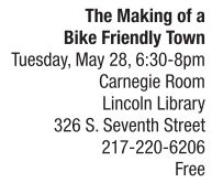 ENVIRONMENT | We-cycling Sustainable Springfield, Inc. invites the public to its free program at Lincoln Library titled “The Making of a Bike Friendly town.” Ed Barsotti, executive director of the League of Illinois Bicyclists (LIB) will discuss the national trend of communities recognizing and using cycling as an alternative method of transportation. He will talk about what it takes for cities like Springfield to catch the momentum by focusing on infrastructure and bicycle/pedestrian safety. See also
