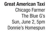BAND SPOTLIGHT | Great American Taxi/Band Spotlight Considered some of the best Americana artists touring today, the “Americana Without Borders” music of Vince Herman, Chad Staehly, Jim Lewin, Chris Sheldon and Brian Adams sparkles with rock-n-roll raunchiness, subtle piano nuances, blazing folk splashes and jam-band freedoms, roiling into a creative melting pot of brilliant musicmaking. The effervescent live performances bubble over with expert musicianship honed by years and years of playing and playing, giving the combo a wonderful mix of improvisational character backed by road-hardened experience. The group did some time as the backup band for singer-songwriter-storyteller Todd Snider, who returned the favor by producing GAT’s last recorded effort, Paradise Lost, released in 2012. On the latest record the band has “shed the jamming and gone for the throat with focused songwriting and tight musical arrangements” dealing with current issues of “mountaintop removal, nuclear energy, poor economic conditions or a soldier returning from war.” Joined at this venue by Chicago Farmer and The Blue G’s, this “Americana Dinner Show” is a truly a treat. See also