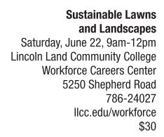 ENVIRONMENT | Yards of green Lincoln Land Community College’s Workforce Development division offers workshops this summer for the general public to learn or improve their work skills, but others with a personal interest in the subject matter may sign up, too. Sessions include topics such as welding, forklift safety and biodiesel production. One course caught our eye – Sustainable Lawns and Landscapes. Held Saturday, June 22, you will learn how to design, implement and maintain an attractive and environmentally friendly lawn and landscape. Instruction will include proper plant selection and maintenance techniques without overuse of chemicals, water and gasoline. Register online or by phone.