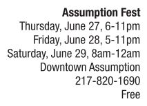 FESTIVAL | No place like home A small town with a big festival, Assumption Fest, held June 27-29 in the town of Assumption, has activities to rival larger venues. Only 40-45 minutes from Springfield, highlights are Thursday’s many pageant contests for all ages and a multi-category pet contest; ongoing chainsaw demos; Macon Speedway show car; Solution Action Sports BMX stunt show at 1, 4 and 6 p.m. on Sat. performing bike tricks to music and providing bike safety tips and T-shirts; bands Big Shake Daddies, Maiden Dixie Band and The Shake; large parade at 11 a.m. on Sat. with afternoon volleyball, washer and water ball tournaments; historical reenactments; flea market and more. There’s also regular fair fare -- Little Egypt carnival, tractor pull, 11 food vendors and more. Bleachers and chairs are available for seating or you can bring your own. An impressive 132-page book that lists the entire schedule is available at locations in Assumption, Taylorville and surrounding locations. And like admission, the book is free. Only the beer tent has an admission charge says Angie Ohl-Marsters, fest president and 30-year volunteer. See also