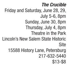June 28, 29, 30, July 4, 5, 6 are the dates of Theatre in the Parks’ next production The Crucible at Kelso Hollow outdoor amphitheatre, New Salem. Directed by Carly Shank, this Arthur Miller classic drama features the 1692 Salem witch trails under the allegory of the 1950s McCarthy trials. John O’Connor of Springfield takes on the lead role of John Proctor. Folks are urged to attend free preshows at 7 p.m. A musician will be featured followed by director Carly Shank. Shank, who had directing The Crucible on her “bucket list,” has a wealth of info not only about the local production but the history on which the play is based. Performance evenings, the box office is open 5-8 p.m.