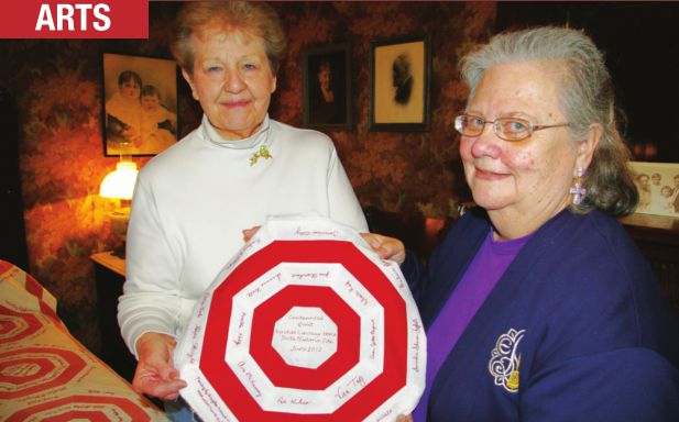 Joining Battles on the project by embroidering names on the new quilt are individuals from Springfield’s Prairie Arts Chapter Embroiderer’s Guild of America. Hope Wright, PACEGA president, says the time-consuming and intricate work, using single-ply floss and the smallest needles the group can thread, “averages two hours per name. We bought extra magnification because the names are so small.” Members involved in the volunteer venture, besides Wright, are Martha Kelly, Avis McKenney, Jane Ehrenhart, Susanne Wall, Saundra Scheuer-Syfert, Barbara Peake, Roberta Reif and Caren Bryant.