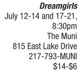 THEATER | Girl power Springfield Municipal Opera (The Muni) and Illini Bank will present the musical masterpiece Dreamgirls, July 12-14, 17-21 at its outdoor amphitheater. The storyline follows a 1960s girl singing group that comes into fame and fortune. The musical was inspired by the Motown girl group, The Supremes. Nominated for 13 Tony awards and winning six, folks may be most familiar with the 2006 film that starred Jamie Foxx, Jennifer Hudson, Beyonce and Eddie Murphy. Reserved-seating tickets are $14, while lawn seating is $10, available at the box office onsite. Wednesday nights are family nights and children under 12 are half price with the purchase of a paid general admission ticket. Directed by Craig Williams, II. See also