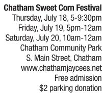 FESTIVAL | Sweet and corny Scrumptious grilled or boiled ears of goodness await you at Chatham Sweet Corn Festival July 18-20 at Chatham Community Park. Chatham Jaycees are preparing all that yummy fun you’ve come to know. The three-day fest kicks off Thursday celebrating its 40th year with $1 beers and hotdogs, more than 20 beers on draft, free parking from 5-7, The Blue G’s at 6 p.m., a program honoring 40 Sweet Corn Festival chairmen and fireworks around 9. (Chatham Library also has a display of the history of the Jaycees and the fest.) Friday night continues with food, the Little Miss Pageant and music. Saturday features demos, music, the infamous cow chip throw (sign up anytime before or during, two throws for only $5), blues music thanks to the Central Illinois Blues Club, Allman Brothers tribute band The Brothers at 6:30 and country band Still Kick’n at 8:30 p.m. Like to shuck? Help shuck Wednesday or Thursday nights at 5 p.m. See also