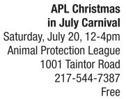 PETS | Cool cats and dogs Here’s a fun gift for the family and a cool way to help our pet friends. Venture out to the Animal Protective League (APL) Christmas in July Carnival Saturday, July 20, at its shelter. Activities for all ages will be featured including carnival games, scavenger hunt, present-wrapping contest, dog-kissing booth and photos with Santa (until 3 p.m., $5). Try your hand at the dunk tank and watch local celebrities such as Mike Quimby from Green Hyundai, Wes Barr and State Journal-Register reporter Alisa Groeninger squirm or drop. Attendees can also tour the shelter and clinic, purchase light snacks such as cotton candy and meet some of the adorable and adoptable dogs and cats. See also