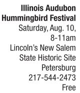 Sangamon River Chapter of the Illinois Audubon Society, Illinois Audubon Society and Lincoln’s New Salem State Historic Site host their annual Hummingbird Festival on Sat., Aug. 10, at Lincoln’s New Salem State Historic Site. This is your chance to see these unique birds up close during a capture and banding as the birds are migrating south. This is a free family event that you can attend at anytime between 8 and 11 a.m. Visitors can adopt a hummingbird and may be able to release it back into the wild if the bird is cooperative. Donations from adoptions go to Lincoln Land Association of Bird Banders.