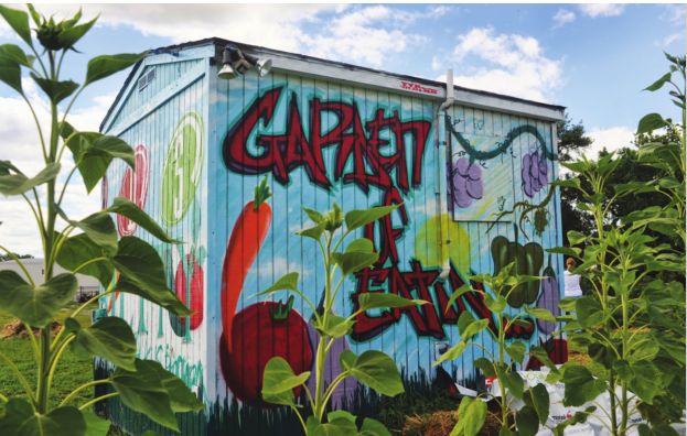 the Seeds of Possibility Garden, the brightly painted toolshed exudes