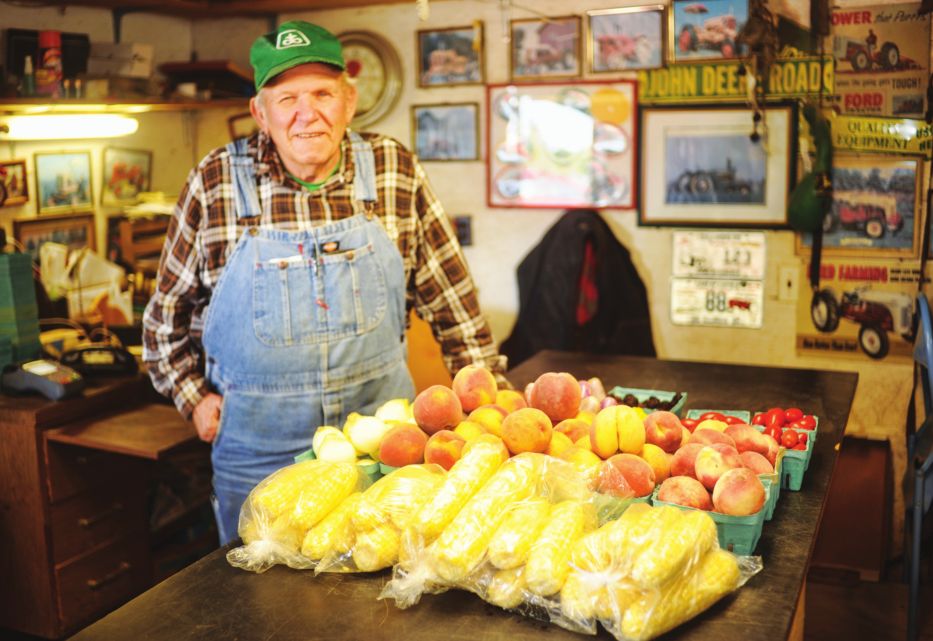 outbuilding where produce for sale is spread around him. Dressed in a