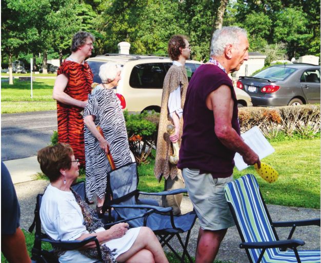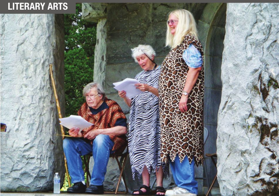 The event’s highlight was each awardee’s donning a ceremonial skin (sewed by Carolyn Jackson’s bone needle; no harm done to beasts) who then ascended the steps to repeat vows of loyalty to the muses of creativity. Each received a certificate from the Grand Pooh-bah: “We present you with this award, framed with embossed stegosaurus skin. Do not use it for a club.”