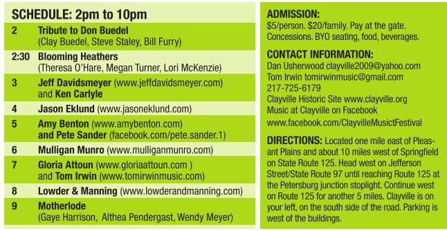 24, at the Clayville Historic Site, about 10 miles west of Springfield near the village of Pleasant Plains, this notion of performance as a way of presenting culture and tradition will spring to life at the Clayville Folk Festival. Twenty-five years ago, during the modern heyday of the Clayville site, a music festival was an annual event, well attended and