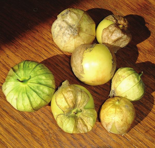 Like their closest cousins ground cherries and Chinese lanterns, tomatillo fruits are enclosed in a papery outer shell. They are ripe and ready to use when the fruit has grown to the point that it completely fills the shell, or even has burst it open a bit. After peeling away the papery shell, you’ll find that tomatillos’ surface has a sticky coating. It’s not harmful, but should be rinsed off before using.