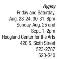 The legendary musical Gypsy, considered by many to be the best American musical ever written, will be presented Aug. 23-25 and Aug. 30-Sept. 1 at Hoogland Center for the Arts. Based on memoirs of Gypsy Rose Lee, the show tells the backstage tale of vaudeville entertainer-turned-stripper Gypsy Rose Lee and her domineering mother Rose. Rose battles agents, theater owners and stage managers in her efforts to push her two daughters toward stardom during the dying days of vaudeville. Gypsy contains many songs that became popular standards, including “Small World,” “Everything’s Coming up Roses,” “Together” and “Let Me Entertain You.” Featuring a full orchestra and a cast of talented local performers including Mary Kate Smith as Madame Rose and Devin Dinora as Louise/Gypsy Rose Lee, the musical is directed by Gus Gordon.