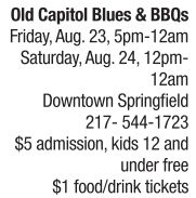 If you love barbecue and good music, the Old Capitol Blues & BBQs festival is for you. With a host of scrumptious sauce-covered meats to taste, you can also vote for your favorite to determine barbecue competition winners. The music rocks with a host of musicians and headliners James Armstrong on Friday at 10 p.m. and John Saint Holiday and Elliot Sowell on Saturday at 9:30 p.m. The Illinois Central Blues Club Challenge starts Saturday at noon. Kids’ activities run from 2-6 p.m. on Old State Capitol Plaza South and include face painting, karaoke, Elvis Himselvis, magic by Jim Percy, a juggler and clown. Admission gates are at the east corners of the square and on Washington at Fourth and Sixth. Downtown Springfield, Inc.’s website has more details, www.downtownspringfield.org.