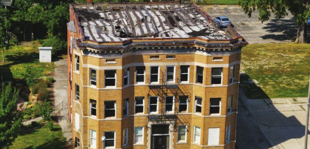 The roof of the three-story apartment building built in 1910 has caved in under Eglaston’s watch, its demise carefully recorded in a series of before-and-after photographs tucked inside a file in Sangamon County Circuit Court, where the city sought a demolition order. The interior is gutted. Cracks mar the masonry. Last week, Eglaston removed the exterior bay windows, poking large holes in the eastern wall to complement the hole in the roof – look up from the ground and you can see blue sky.