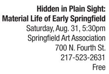 The Springfield Art Association’s latest exhibit, up through Oct. 5, explores the architecture, archaeology, fine arts and decorative arts of Springfield from the 1820s-1850s. Highlights include photos of local antebellum houses, daguerreotypes, 1830 Edwards Place privy ewer and door, 1830s sofa and piano from Lincoln’s wedding ceremony and more. An opening reception is Aug. 31 at 5:30 p.m. SAA Gallery of Art is open 10 a.m. to 5 p.m. Monday through Friday and 10 a.m.-3 p.m. Saturday. In conjunction with the exhibit, SAA will host a free lecture series, Sept. 5, 12, 19 and Sept. 26. On each of these dates, one of four experts will talk more in depth about the material life in 1800s Springfield.