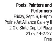 Creatives from Springfield have been working together making art, poetry and music inspired by each other’s work. You can hear and see the final pieces on Friday, Sept. 6, at Prairie Art Alliance Gallery II, located on the south side of Old Capitol Plaza. This opening reception includes poetry readings by Springfield Poets and Writers members; Prairie Art Alliance artists talking about their work; music by local musicians Josie Lowder (pictured), Tom Irwin, Julie Hulvey and Ben Jacob; and free wine and hors d’oeuvres while they last. The exhibit will be on display and for sale at the gallery (open Tuesday-Saturday 11 a.m. to 4 p.m.) through Sept. 26. Learn more at prairieart.org and springfieldpoetsandwriters.com.