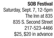 Springfield Oyster and Beer Festival celebrates craft beer. Held Sept. 7 in the parking lot of the Inn at 835, the gathering of breweries from across the U.S. also includes tasty seafood and other eats, music by Harmony Deep and Thornhill and exhibits. Admission tickets include a tasting glass and five drink tickets. Additional drink tickets are $1 each, with most beers costing one ticket for a four-ounce sample. Some rare beers may be two or more tickets. All proceeds go to a local charity. Tickets are available at Obed & Isaac’s Microbrewery and Eatery, the Inn at 835, Friar Tuck, Roberts Seafood, any Qik N EZ or online at sobfestival.com.