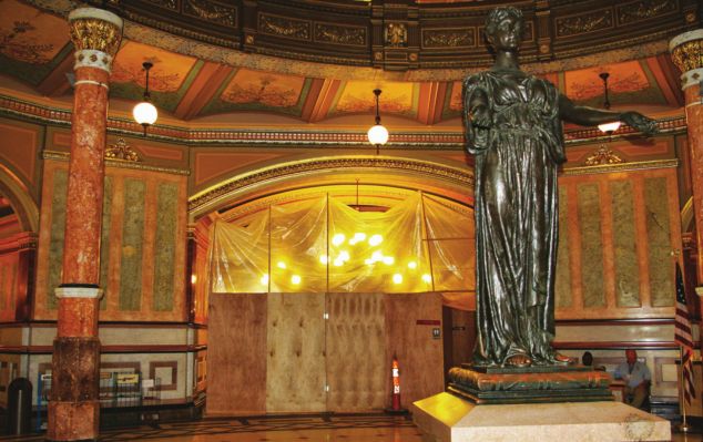 Soon, the West Wing of the Illinois Capitol will emerge after two years inside a cocoon of plywood and tarps. The structure was closed off, paradoxically, to make that part of the building both newer – by upgrading the building’s mechanical systems and making access and safety improvements – and older, by restoring it to its 1888 appearance. Seldom do state official achieve the spectacular, and even less often do they do so within their budget, yet previews of the work suggest that Richard Alsop, the Architect of the Capitol, and the craftspeople and technicians on the job have pulled it off.