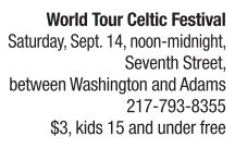FESTIVAL | Must-go for gusto St. Andrew Society of Central Illinois puts on the best parties. You are invited to its first ever World Tour Celtic Festival, Sat., Sept. 14, from noon until midnight held downtown outside Celtic Mist, the festival sponsor. Almost every area Celtic band and musician will play throughout the day including Celtic Cross Pipe and Drum Band, pictured. Celtic eats will be served up by Bennigan’s, Irish and Scots dancers will perform and you won’t want to miss the whiskey seminars. Other highlights are a kids’ area with bounce house, face painting, tea with Mary Queen of Scots, photo op with knights in armor; and contests for adults such as for the best redhead, bonniest knees and best jig. The festival is a fundraiser for the group, which is invited to perform at the world champion athletic event in Scotland next year, an exciting honor for any Celtic dancer or musician. SASCI hopes to make the festival an annual event, with the prospect of performances by visiting talent from its sister city of Killarney, Ireland. See also
