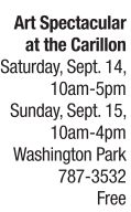 ART | Picture perfect Art Spectacular at the Carillon takes place this weekend, Sept. 14-15, on the grounds around the carillon. The two day, juried art show features 50 regional artists, a number of participants that co-chair Barbara Walker calls a “full house.” (Walker’s co-chair is Sheila Albright.) Other highlights include carillon music for 10 minutes at the top of every hour, local musicians, demos, food by Chadito’s, and a silent auction that includes an Isringhausen import for a weekend and a $100 gift certificate to Indigo. Kids 5-12 years old can buy artwork donated by participating artists on Saturday. And, the Kids’ Place features comic book artist Robert Atkins on Sat. at 12:30 p.m., noodle art on Sunday from 12-3 p.m. and face painting both days by Phil Martin. Entrance to Kids’ Place is $1.25 per child. During the art fair, the Fayette Avenue parking lot is handicap parking only. Guests may park in the rose garden parking lot.