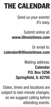 Steam Show and Fall Festival Days Sep 27-29, 7am gates open, Flea market, demos, displays, entertainment, mag repair and swap tent, antique tractor and horse pull. $5 wristbands good for all three days. Kids under 12 free. Prairie Land Heritage Museum, 1005 West Michigan, South Jacksonville, 494-7105 or 673-4921. Books & Authors Banned Books Readings Sep 25, 1-2:30pm, Students and faculty will read selections. Free in A. Lincoln Commons. Lincoln Land Community College, 5250 Shepherd Rd, 217-786-2200. Poets in the Parlor Sep 21, 2-4pm, Erika Eckart and Justin Hamm. Free. Vachel Lindsay Home State Historic Site, 603 S. 5th St, 217-524-0901.