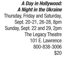 THEATER | Hijinks and hilarity Roxy Theatricals presents the charming and unique musical A Day in Hollywood: A Night in the Ukraine Sept. 20-22, 26-29. The Broadway sensation, directed and choreographed by legend Tommy Tune, is like two plays in one. The first act before intermission features the usher corps from the famed Hollywood Grauman’s Chinese Theatre in a song-and-tap-dance salute to the golden age of classic Hollywood films. The second act, A Night in the Ukraine, is a Marx Brothers farce with Groucho, Harpo, Chico and the gang. Bar service opens in the Legacy Lounge 60 minutes prior to evening performances. Directed by Gary Shull, the cast includes local favorites Ed MacMurdo, Mary Young and Johnny Molson, pictured.