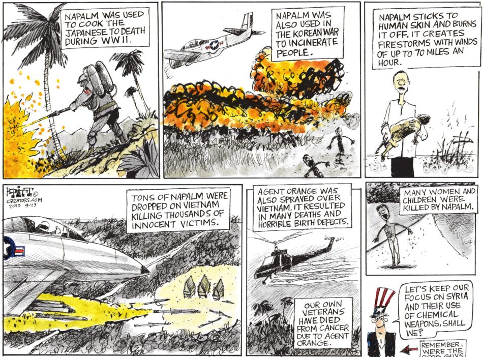 Even at 83, I didn’t need the aide-memoire, but applaud the thought and courage of both the artist and his editors for publishing (“Focus on Syria,” Chris Britt, Sept. 19). Napalm is a war crime, no less than toxic gas, and should be high on the list of such. Robert Evans Springfield