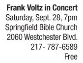 MUSIC | Heavenly harp Harpist, arranger and composer Frank Voltz of North Carolina will play Saturday, Sept. 28, at Springfield Bible Church. Second prize winner in the lever harp division at the 1997 Lyon and Healy International Jazz and Pop Festival Competition, Voltz has played at festivals and venues across the country. In 2012, he was guest clinician for the Central Florida Chapter of the American Harp Society and chapter harpists performed five of his arrangements for harp ensemble in concert. He was commissioned in 2010 to write an arrangement for the American Youth Harp Ensemble and has performed on several occasions with the Winston-Salem Symphony.