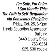PARENTING | The hows of behavior Friends of Funshop invite adults, Friday, Oct. 25, to an informative workshop about discipline for children of any age. The featured speaker, Kim Hughes of Wake Forest, N.C., is a nationally certified instructor with Conscious Discipline and an award-winning educator recognized by President Bill Clinton. Light dinner and registration begins at 5 p.m. with the program at 6 p.m. Walk-ins are welcome, but if possible email or phone to let organizers know you’ll be there. Email Sharon at [email protected] or phone 217-753-6234. Check or cash only. Conscious Discipline is a program that helps children and adults learn to transform tantrums, backtalk, outbursts and other difficult behaviors into healthy emotional expression and cooperation. For more info, visit consciousdiscipline.com. See also