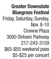 The 27th annual Greater Downstate Indoor Bluegrass Music Festival returns to the Crowne Plaza Hotel Nov. 8-10. Six concerts are scheduled for Friday at 2:30 p.m. and 7 p.m.; Saturday at 10:30 a.m., 1 p.m. and 7 p.m.; and Sunday at 10 a.m. Artists include Doyle Lawson and Quicksilver, seven-time International Bluegrass Music Association’s Vocal Group of the Year winners; seven-time IBMA Female Vocalist of the Year Rhonda Vincent and Rage; and Balsam Range, winners of album of the year 2013. Other activities include a guitar trade show, open stage talent showcase, vendors and instrument workshops presented by Andy Hatfield and Chris Talley Armstrong. For more info, visit bluegrassmidwest.com. See also
