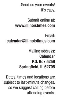 Third Thursday Art Show Nov 21, 6pm-12am. Free, open, all ages art show with local acoustic music and one band at end of night. 217-691-1301. Donnie’s Homespun, 107 West Cook Road, 323-782-9000.