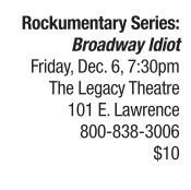 The Legacy Theatre continues its “brew and view” rock documentary series with the last of three screenings. Friday, Dec. 6, see Broadway Idiot. From punk mosh pits and sold-out stadiums to the Great White Way, this electrifying documentary follows Green Day’s Billie Joe Armstrong as he works with producers to turn his mega-hit album, American Idiot, into a Broadway musical. The film goes behind the scenes to reveal the choices and challenges Billie Joe and the creative team explore to create a one-of-a-kind musical experience. A transformative journey for Billie Joe, the film provides an insider’s view as rock stars and stage stars collide and create something never seen before. Bar opens at 6:30 p.m. For more info, see www.atthelegacy.com.