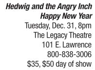 Make sure to phone ahead for reservations to Hedwig and the Angry Inch Happy New Year because we’re not sure this limited seating New Year’s Eve shindig will not sell out by press time. The Legacy Theatre will rock in the New Year with music from two great bands, spirits and a dance party. The doors and bar will open at 7:30 p.m. Tribute band Black Queen takes the stage at 8 p.m. At 9 p.m., Walnut Street Winery will present a wine tasting. At 10:15 p.m., the internationally ignored song stylist Hedwig and the Angry Inch returns to share the story of her search for stardom and love. Following is a midnight champagne toast and dance party. The rocking evening will pay tribute to the greats from Queen to David Bowie to Lou Reed to Iggy Pop. (Don’t miss Roxy Theatricals production of Hedwig and the Angry Inch Jan. 17-18, 23-25, 30-31 and Feb. 1.)
