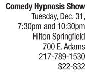 COMEDY | Mesmerizing merriment Nationally known hypnotist and comedian Doug Thompson brings two hilarious shows to the Hilton Springfield’s Grand Ballroom on New Years Eve. Don’t miss this chance to see Doug mesmerize audience members into outrageously entertaining situations. Must be 21years of age. Doors open one hour prior to show. The ballroom is on the Mezzanine level. Tickets are nonrefundable. Make reservations by phone or online at ithappensatthehilton.com.