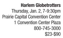 SPORTS | Jumping hijinks The world-famous Harlem Globetrotters bring their hijinks to Prairie Capital Convention Center on Thursday, Jan. 2. Last year, fans were able to vote on new rules to add to the Globetrotter game. It was such a success in 2013 that they are doing it again this year. The 2014 Fans Rule World Tour will include new rules, such as Hot Hand Jersey, where a player wearing this jersey gets double the points when scoring. There’s also Make or Miss, where the quarter starts with two players on each team. When a team scores, a teammate may enter the court. When they miss, a teammate must leave the court. Fans can vote on their favorite, crazy rule by visiting www.harlemglobetrotters.com/rule. Tickets for the game are available by phone or via the PCCC website at springfieldpccc.com.