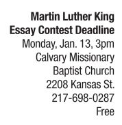 Ministerial Alliance of Springfield and Vicinity hopes to expose youngsters to the ideas of Dr. Martin Luther King Jr. via an essay contest. Jan. 13 is the last day for your student or child, grade 5-12, to submit their essay to the Martin Luther King Essay Contest. One winning elementary, middle school and high school student will each be awarded $700. Winners are required to present their essay on Jan. 19 at the Ministerial Alliance Dr. Martin Luther King Jr. Birthday Celebration at Union Baptist Church, 1405 E. Monroe St. Typed essays, between 300 to 400 words, must explore Dr. King’s quote, “He who passively accepts evil is as much involved in it as he who helps to perpetrate it. He who accepts evil without protesting against it is really cooperating with it.” Delivery must be made by 3 p.m. Monday, Jan. 13 to the church.