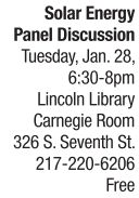 ENVIRONMENT | Stellar info Sangamon Valley Group of the Sierra Club’s monthly educational series and Sustainable Springfield present a panel discussion regarding the installation of solar powered electrical panels benefiting Springfield businesses. Included (pictured from left) are Chef Michael Higgins, Maldaner’s Restaurant owner; Wynn Coplea, IGEN’s program manager; Julie Rourke, Lincoln Land Community College’s Workforce Development Center; Michelle Knox, owner of WindSolar USA; Bob Croteau, CWLP’s Solar Rewards Program and (not pictured) Robert LaBonte of Springfield Bicycle Doctor Shop. See also