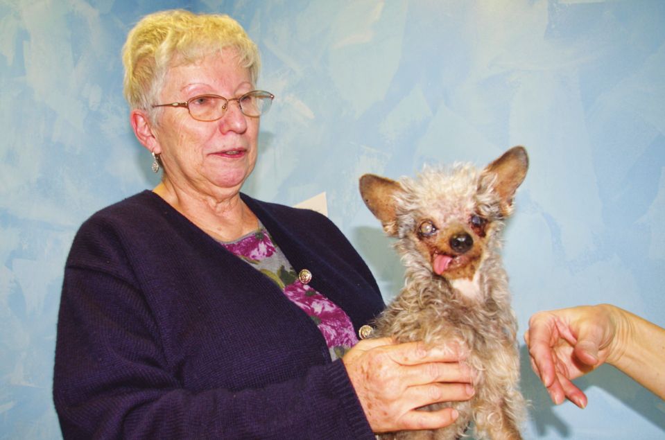 Even with a doggie sweater on, it weighs just four pounds, five ounces, with hair so sparse it would risk a sunburn if this were summertime instead of mid-February. She is deaf, blind and toothless, with cloudy eyes and a tongue prone to hanging limp from the side of her mouth.